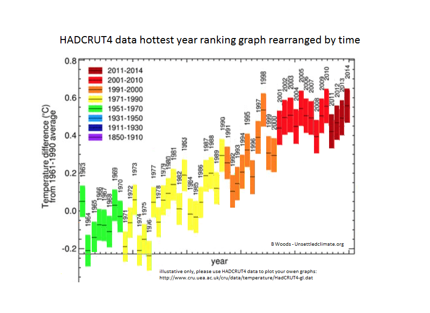 For Illustrative puproses only, wanted to rearrange HADCRUT4 ranking of hottest years graph – by TIME